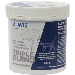 ALAVISTM TRIPLE BLEND pre psy a mačky je kombinovaný veterinárny prípravok obsahujúci 2 typy kolagénu, glukózamín a chondroitín sulfát, MSM (methylsulfonylmethan) a vitamín C. Veterinárny prípravok je určený na regeneráciu pohybového aparátu, najmä pre preventívne podávanie u psov a mačiek.